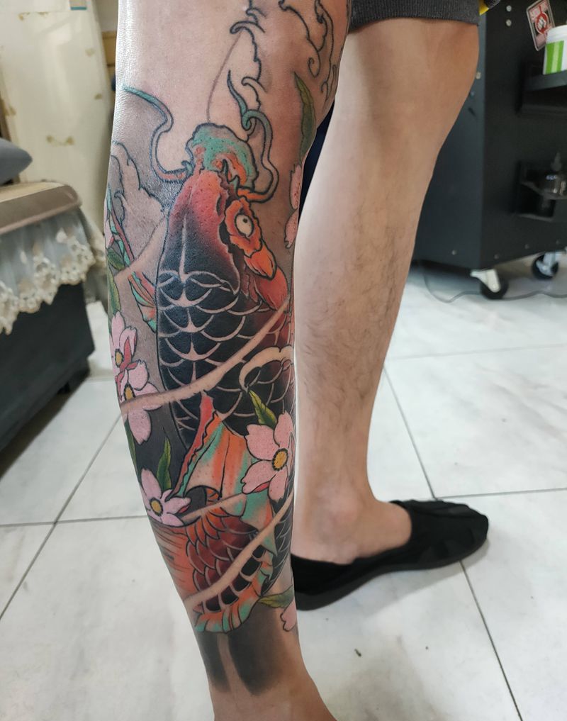 • T网红王老大花腿龙纹身图片_腿部新传统纹身图案