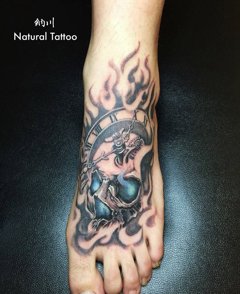当前位置: 首页 >河北省石家庄市纹身店-纳川刺青Natural Tattoo纹身图案>死神和时钟带你走完不好的日子~纹身图片_成品脚部欧美写实字符鬼神原创静物纹身图案