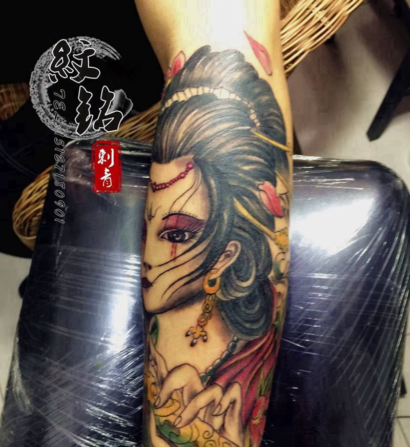 当前位置: 首页 >河北省石家庄市纹身店-纹铭刺青纹身图案>艺妓纹身图片_成品手臂传统人物纹身图案