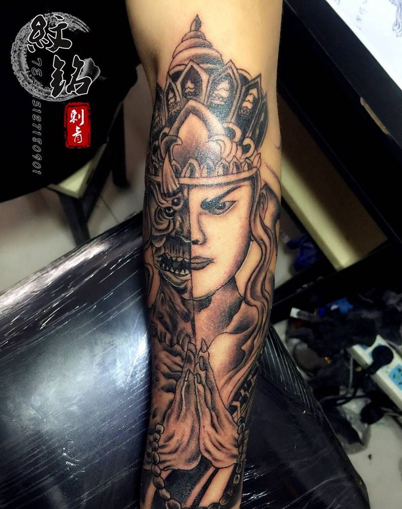 一念之间包小臂纹身图片_成品手臂传统人物纹身图案