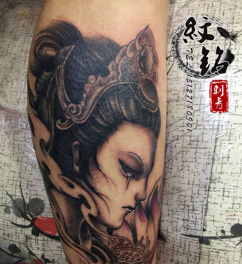 当前位置: 首页 >河北省石家庄市纹身店-纹铭刺青纹身图案>小腿美女纹身图片_成品腿部传统人物纹身图案
