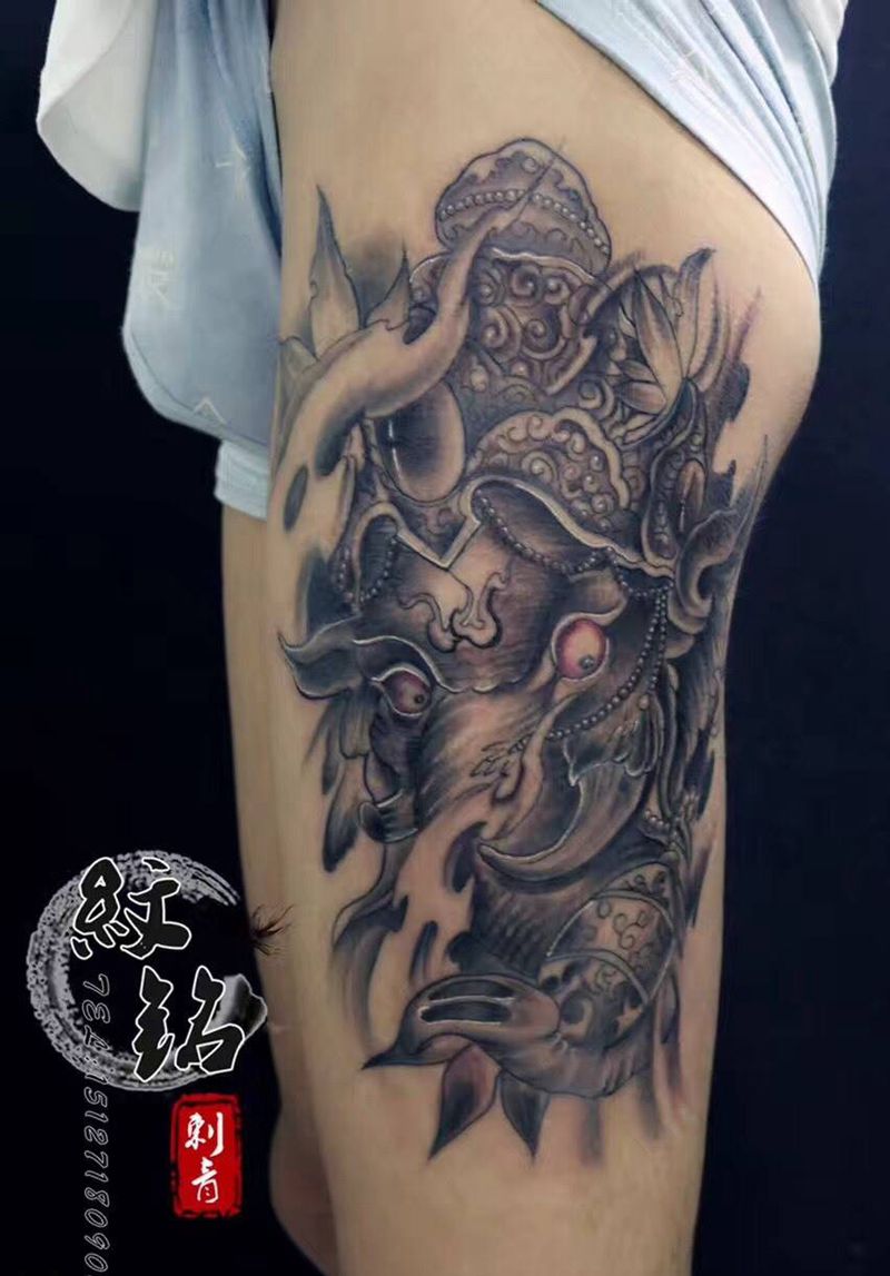 当前位置: 首页 >河北省石家庄市纹身店-纹铭刺青纹身图案>大腿象神纹身图片