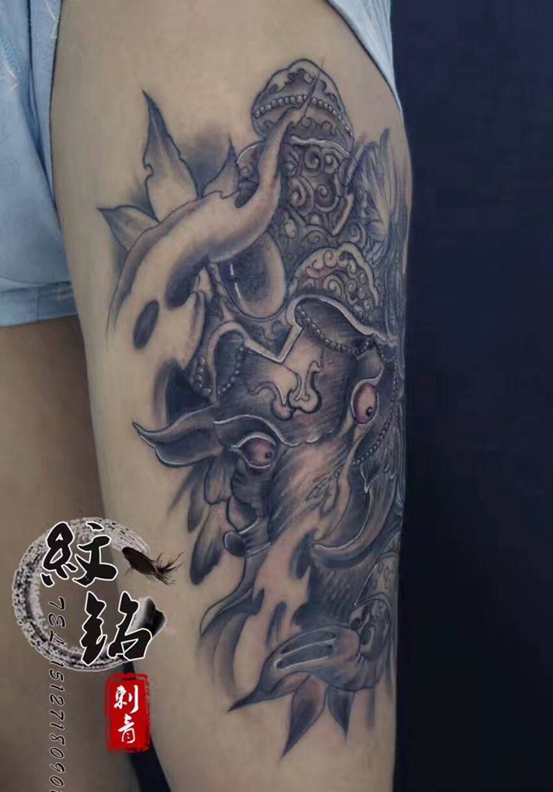 当前位置: 首页 >河北省石家庄市纹身店-纹铭刺青纹身图案>大腿象神纹身图片