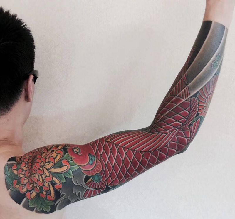 师傅的传统花臂纹身图片