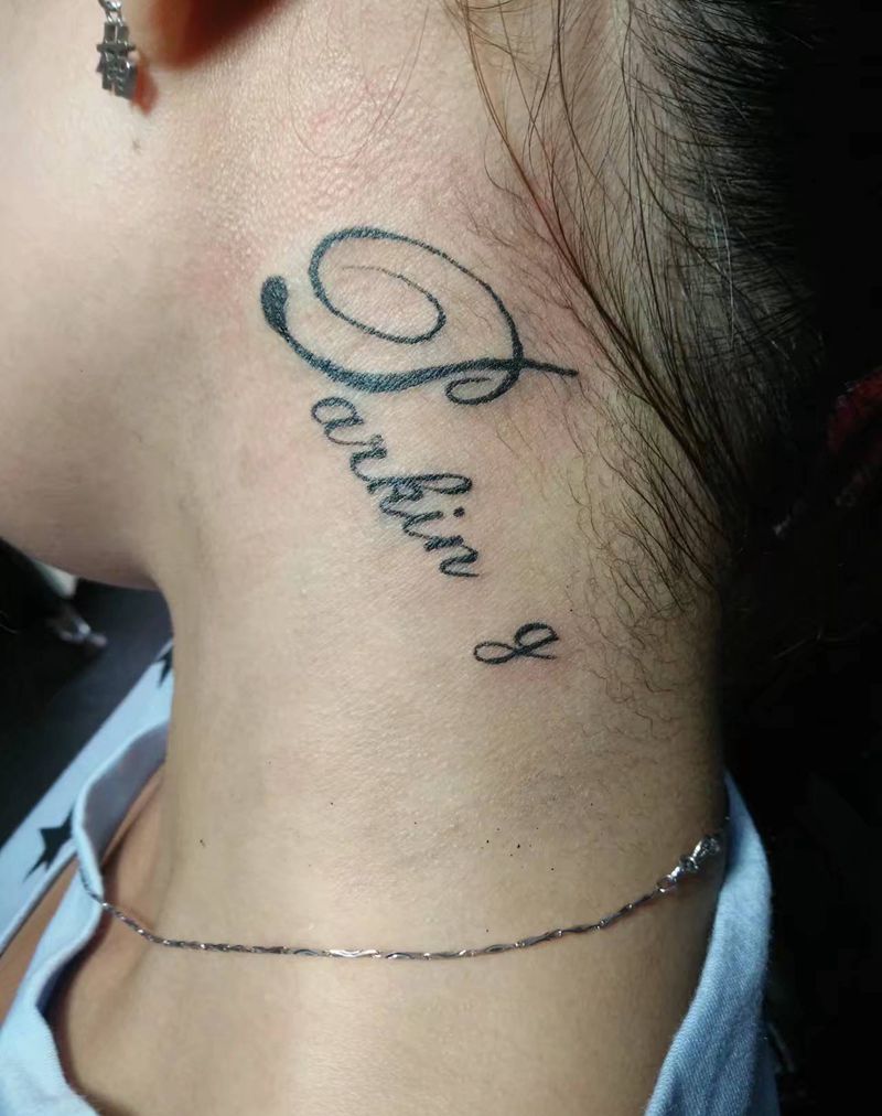当前位置: 首页 >河北省石家庄市纹身店-逸风刺青工作室纹身图案>英文纹身图片_颈部花体字英文纹身图案