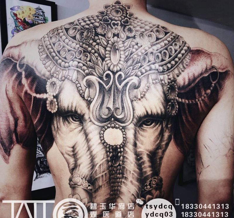 象神 未完待续纹身图片_成品背部传统写实习俗动物鬼神宗教原创纹身图案