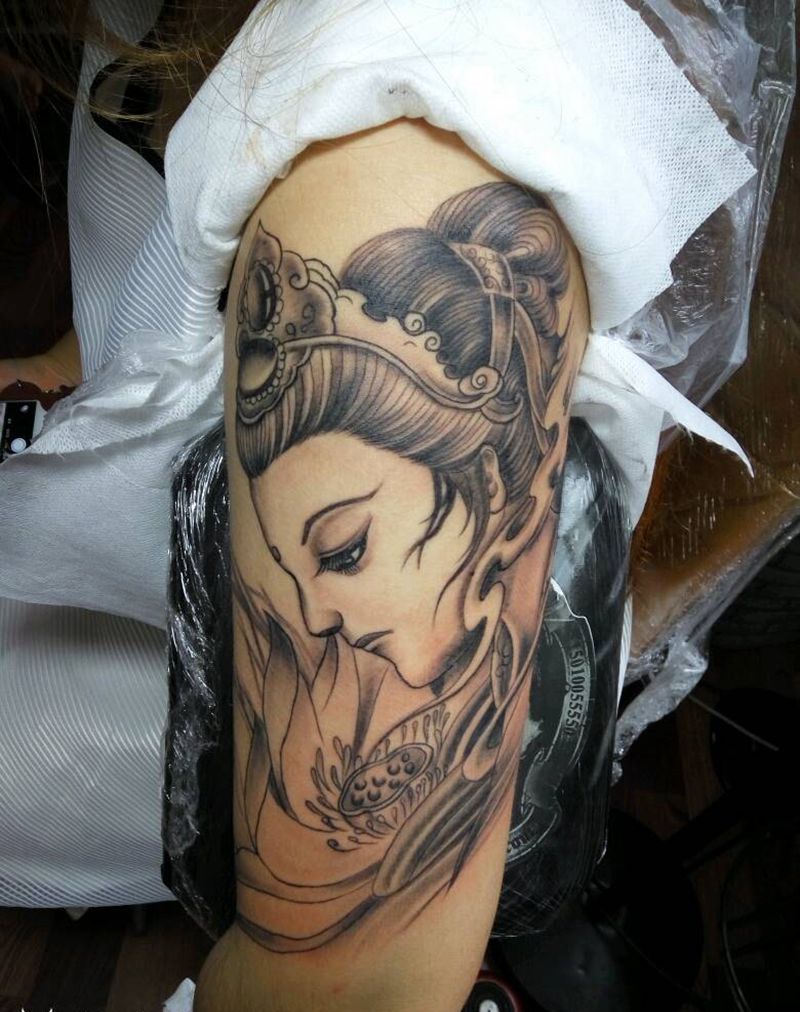 当前位置: 首页 >河北省秦皇岛市纹身店-秦皇刺青纹身图案>大臂艺姬纹身图片_肩部肖像清新人物插画纹身图案