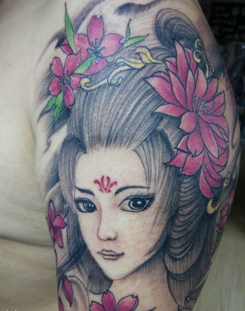 艺妓纹身图片_肩部手臂传统清新人物原创手稿插画纹身图案