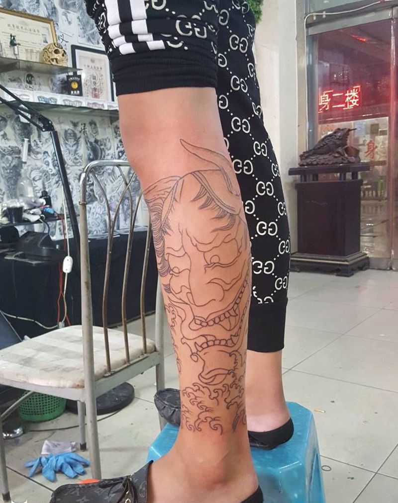 • T网红王老大花腿龙纹身图片_腿部新传统纹身图案