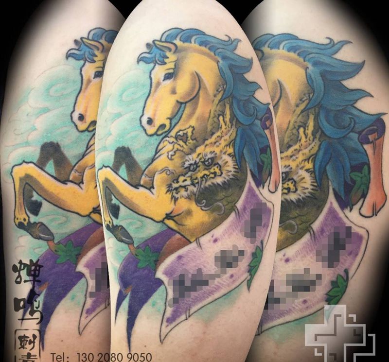 当前位置: 首页 >河北省保定市纹身店-蝉鸣刺青工作室纹身图案>马与龙纹身图片_成品手臂欧美动物字符植物原创纹身图案