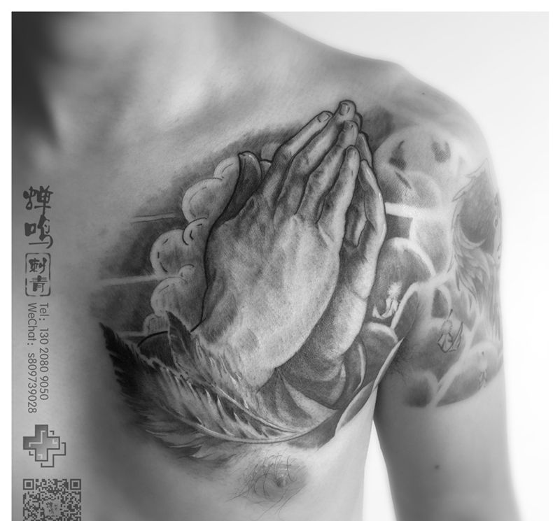 当前位置: 首页 >河北省保定市纹身店-蝉鸣刺青工作室纹身图案>祈祷之手纹身图片_成品胸部写实人物静物原创纹身图案