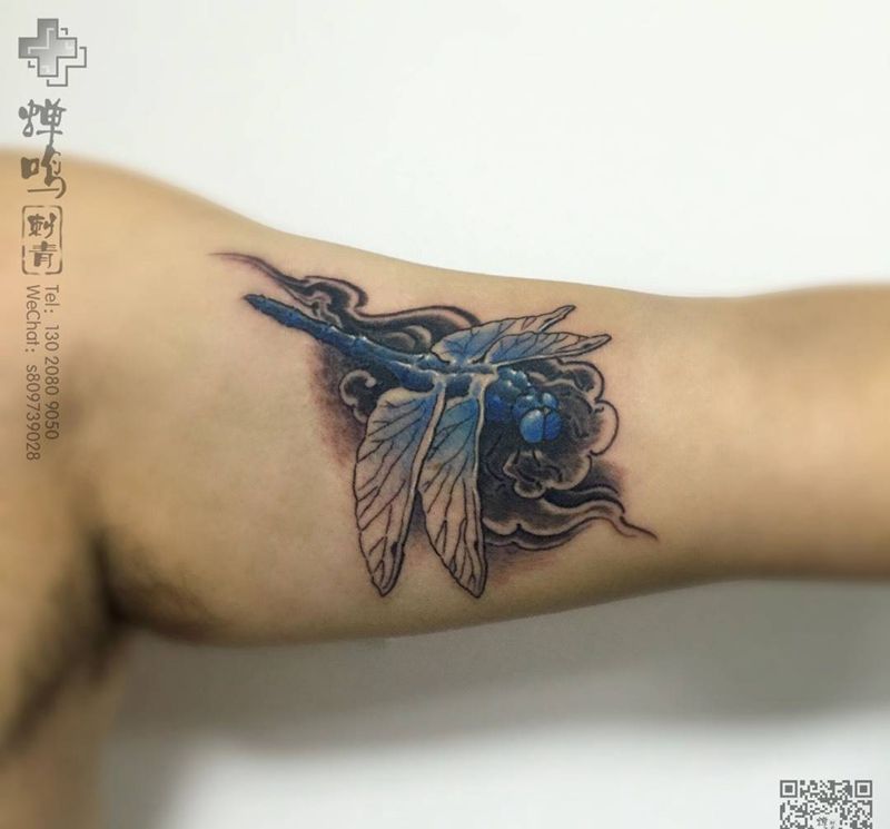 当前位置: 首页 >河北省保定市纹身店-蝉鸣刺青工作室纹身图案>蜻蜓纹身图片_成品手臂传统清新动物纹身图案