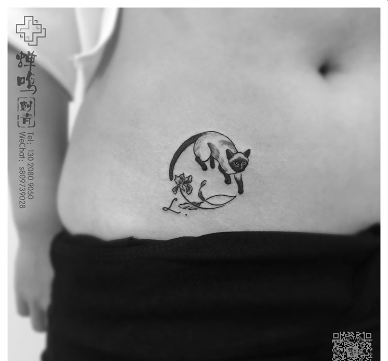 暹(xiān)罗猫纹身图片_成品腹部清新动物植物字符图腾纹身图案