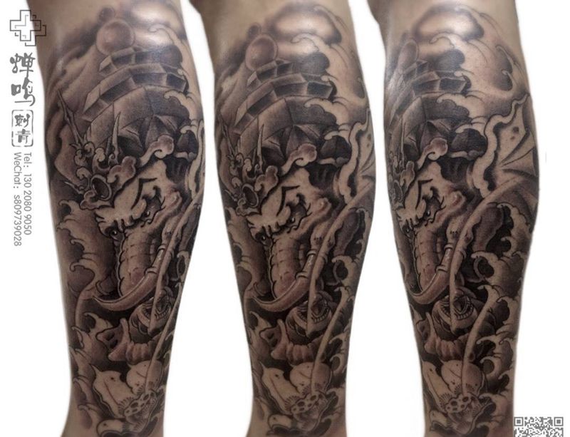 • T网红王老大花腿龙纹身图片_腿部新传统纹身图案