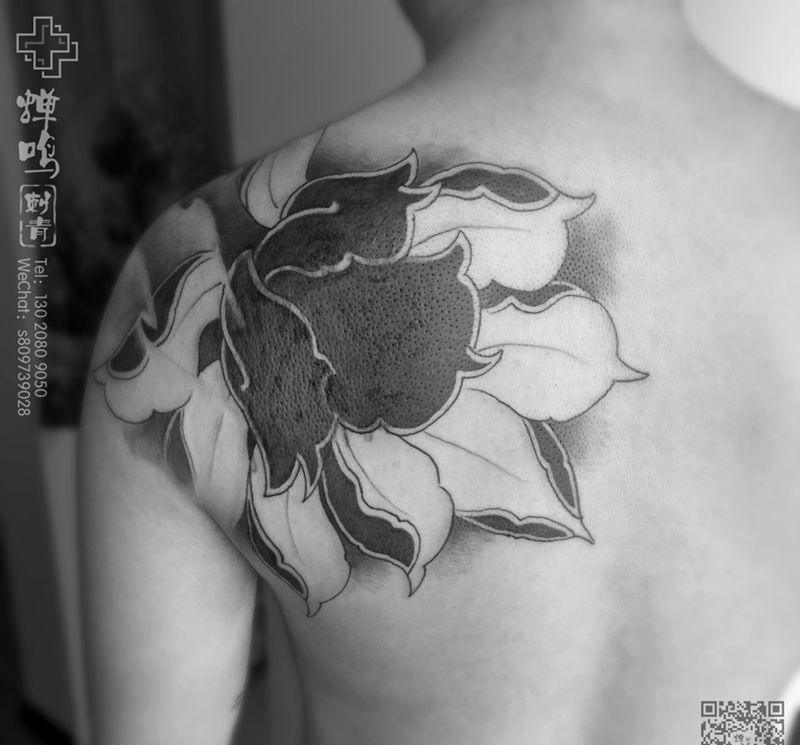 黑荷花纹身图片_成品背部传统植物纹身图案