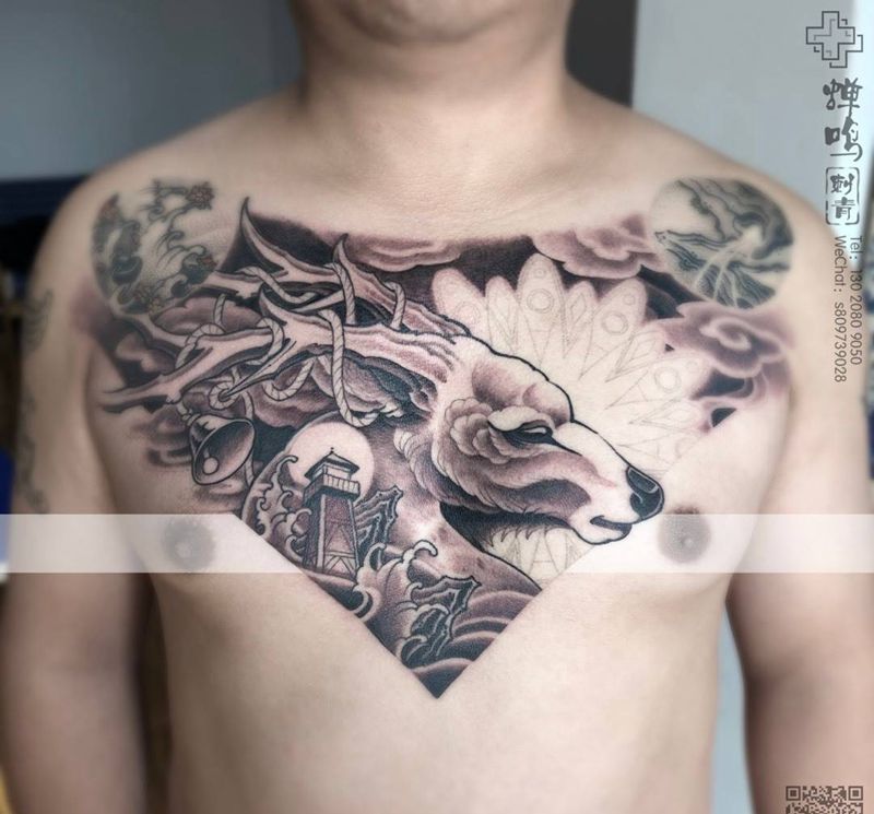 鹿与灯塔纹身图片_胸部新传统New School纹身图案
