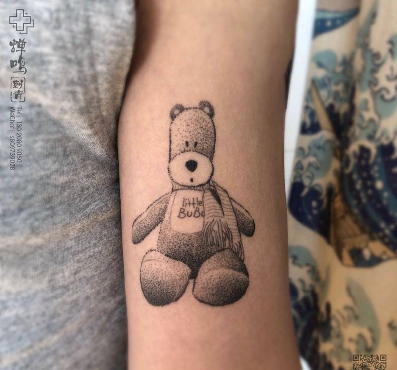 当前位置: 首页 >河北省保定市纹身店-蝉鸣刺青工作室纹身图案>布偶小熊纹身图片_手臂New School点刺纹身图案