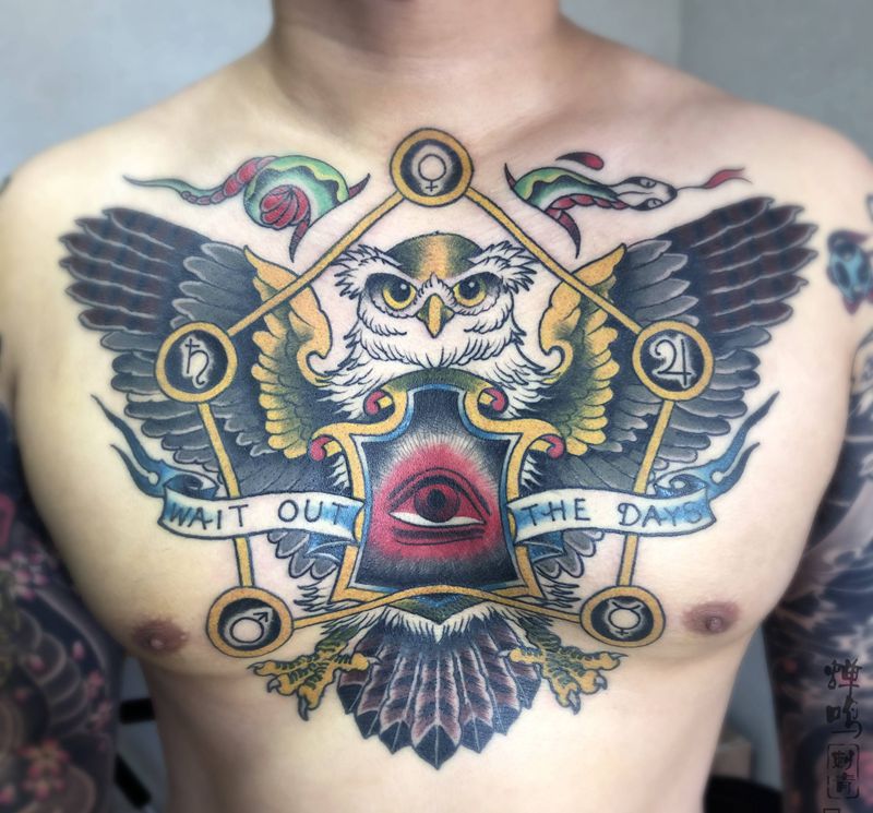 当前位置: 首页 >河北省保定市纹身店-蝉鸣刺青工作室纹身图案>猫头鹰纹身图片_胸部Old School纹身图案