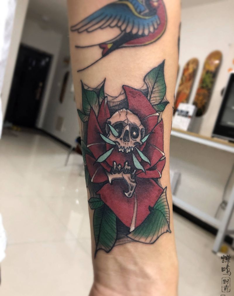 当前位置: 首页 >河北省保定市纹身店-蝉鸣刺青工作室纹身图案>☠️玫瑰花纹身图片_手臂Old School纹身图案