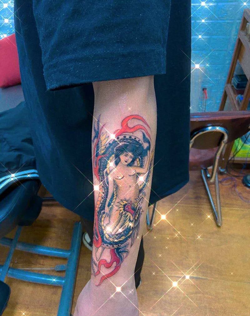 • T网红王老大花腿龙纹身图片_腿部新传统纹身图案