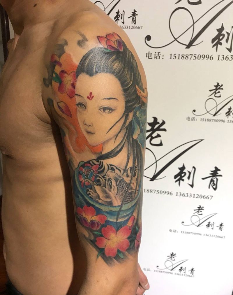 当前位置: 首页 >河北省保定市纹身店-老A 刺青纹身图案>荷花艺妓纹身图片