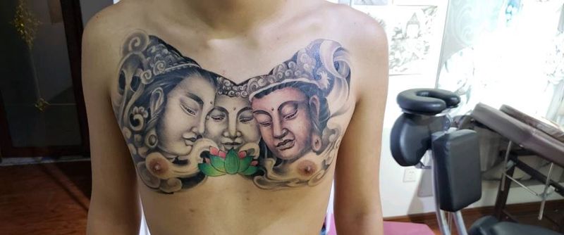 花胸三面佛纹身图片_胸部老传统纹身图案