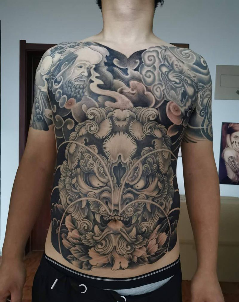 唐狮纹身图片_腹部老传统纹身图案