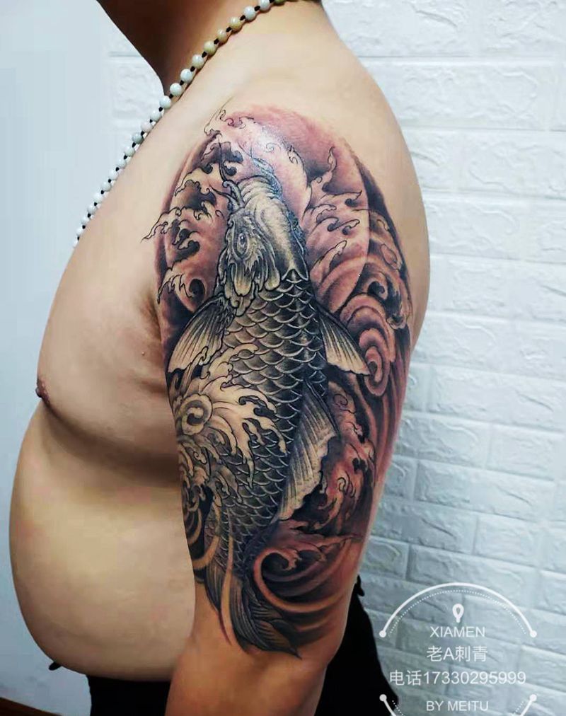 鱼➕遮盖纹身图片_肩部手臂老传统鱼纹身图案