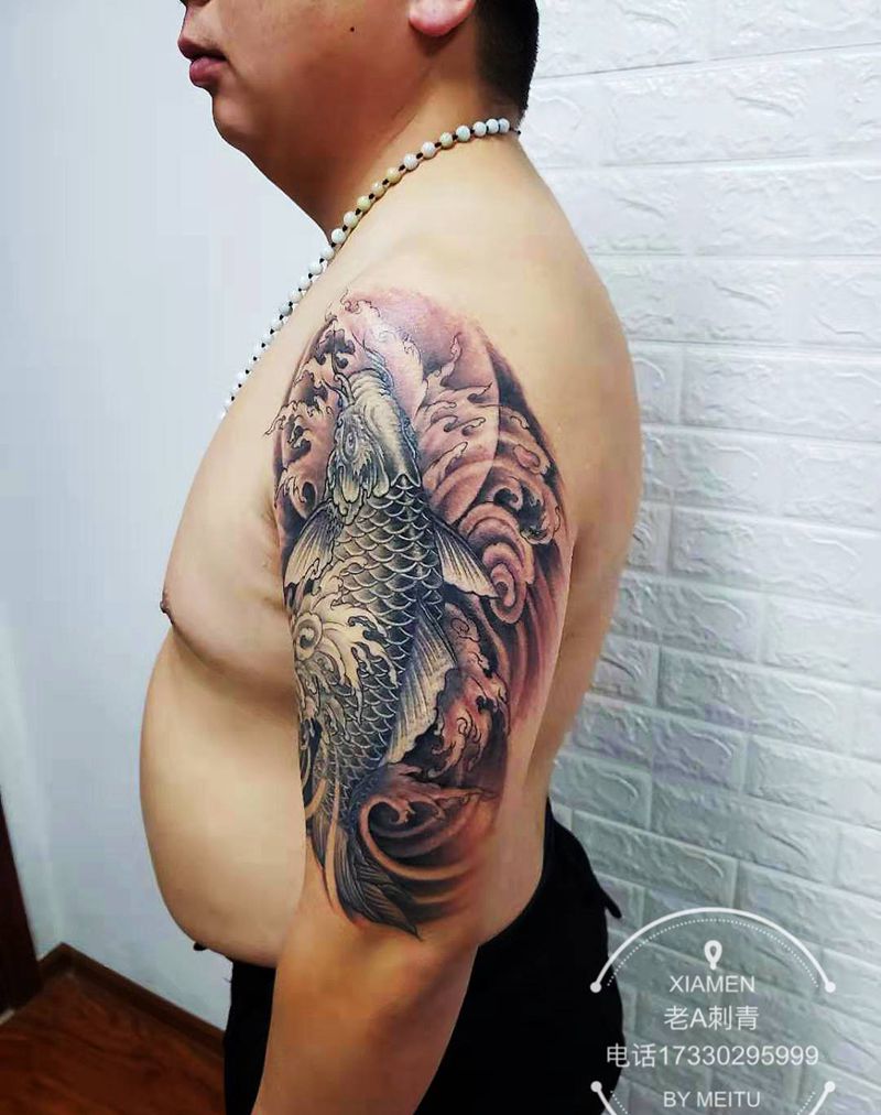 当前位置: 首页 >河北省保定市纹身店-老A 刺青纹身图案>鱼➕遮盖纹身图片_肩部手臂老传统鱼纹身图案