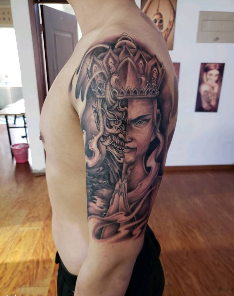 一念之间佛魔纹身图片_手臂老传统纹身图案