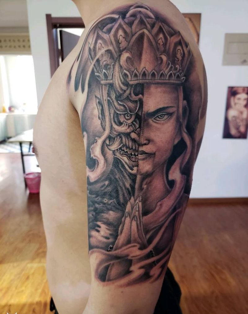 一念之间佛魔纹身图片_手臂老传统纹身图案