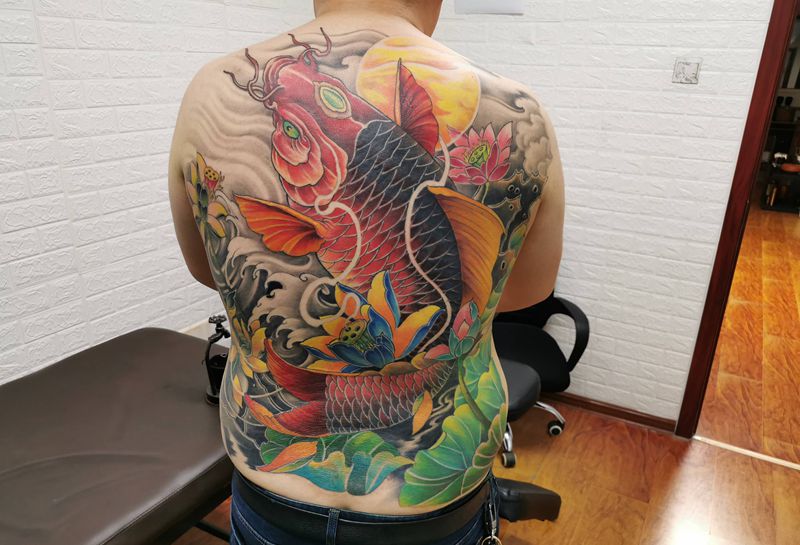 当前位置: 首页 >河北省保定市纹身店-老A 刺青纹身图案>满背鱼纹身图片_背部老传统鱼纹身图案