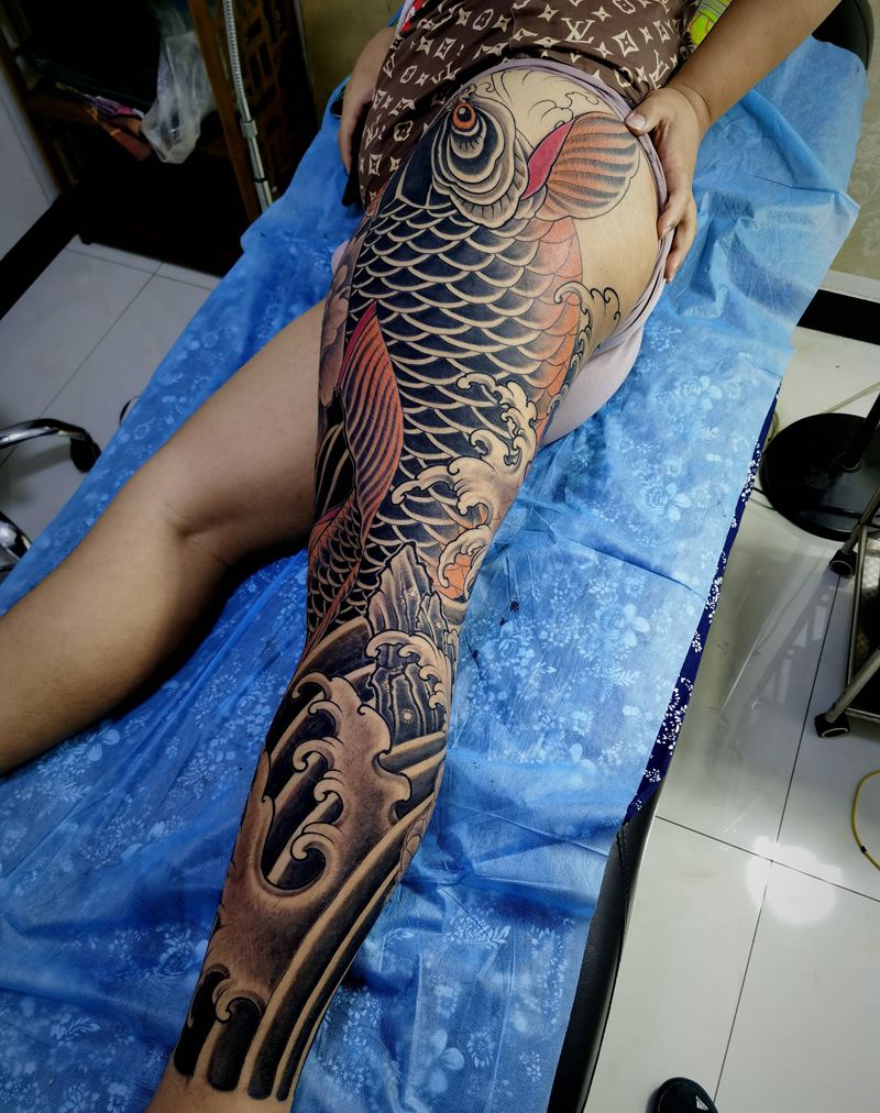 花腿鱼纹身图片_腿部老传统纹身图案