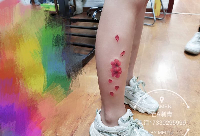 小樱花遮盖纹身图片_腿部新传统纹身图案