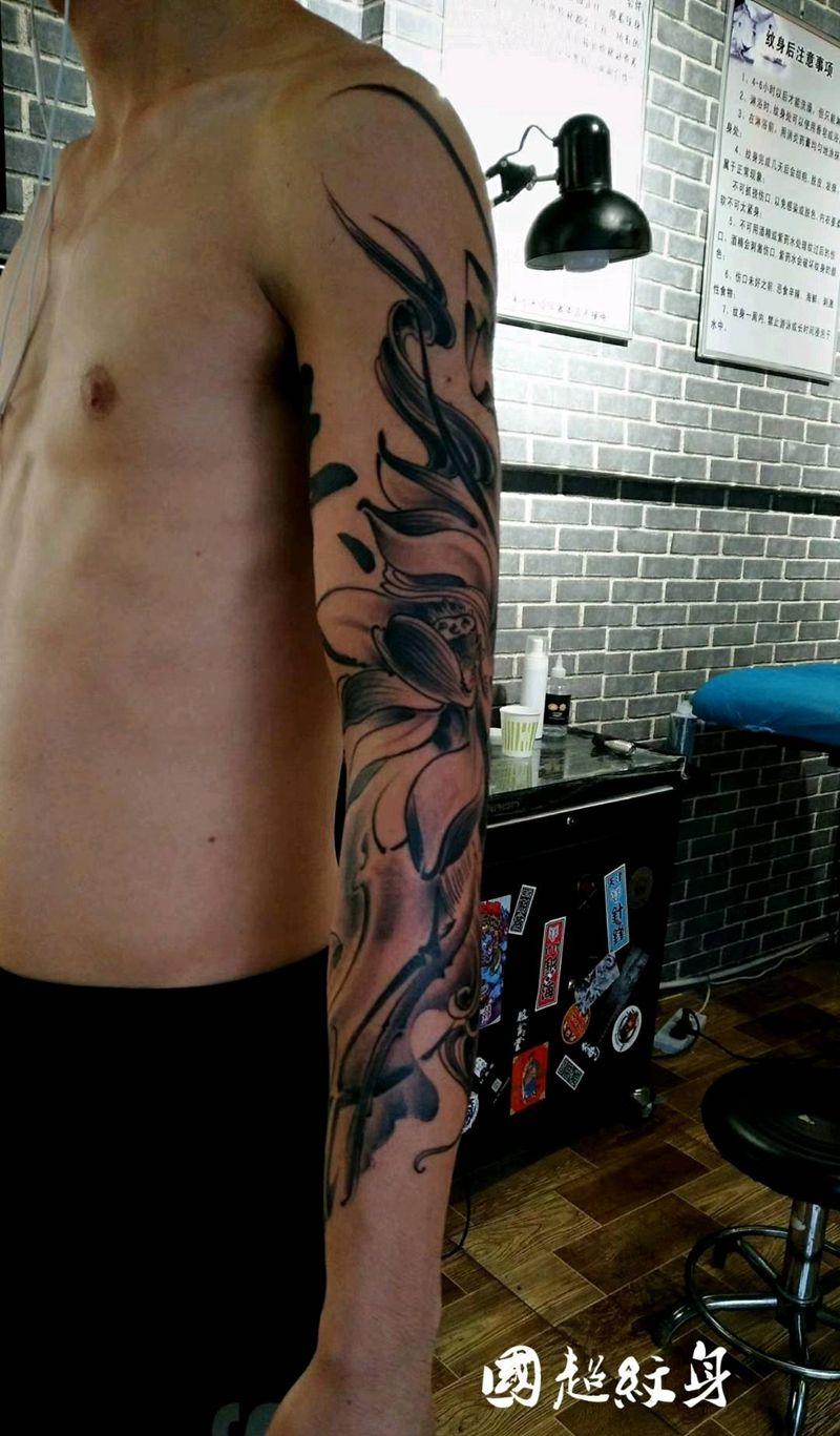 水墨荷花纹身图片_手臂水墨纹身图案