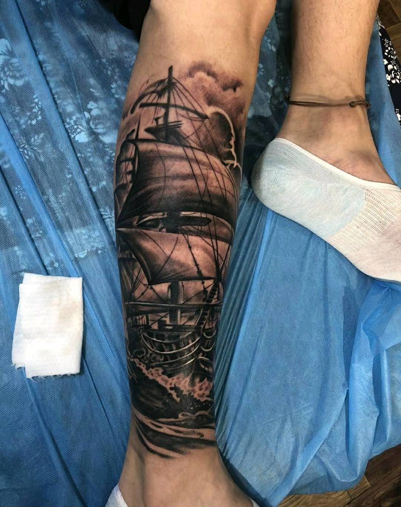 帆船纹身图片_腿部欧美写实纹身图案