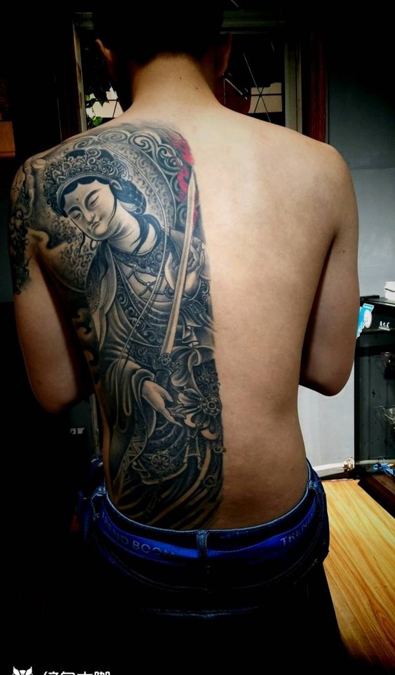 属相守护神纹身图片_背部新传统佛像纹身图案