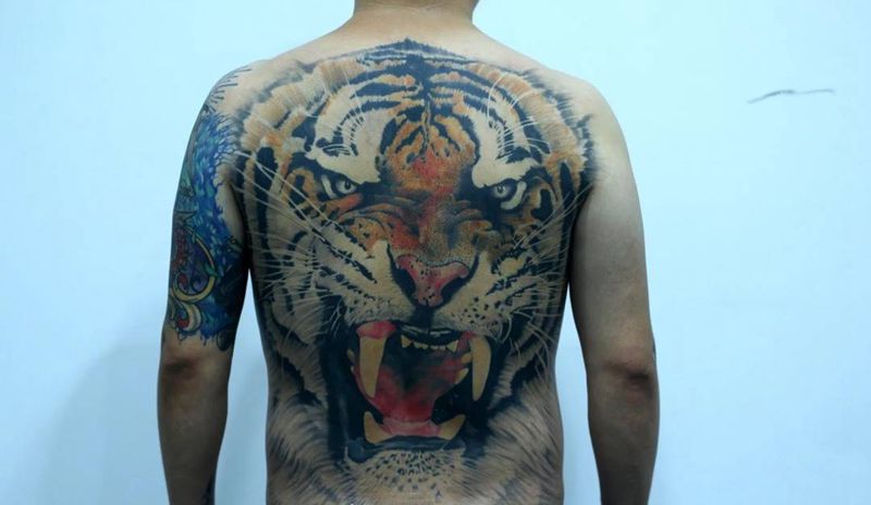 当前位置: 首页 >河北省保定市纹身店-魔罗阁刺青潮店纹身图案>3D超写实老虎纹身图片_成品背部欧美写实动物纹身图案