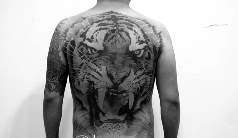 当前位置: 首页 >河北省保定市纹身店-魔罗阁刺青潮店纹身图案>3D超写实老虎纹身图片_成品背部欧美写实动物纹身图案