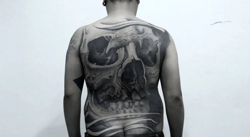 欧美死亡骷髅满背纹身图片_成品背部欧美写实人物鬼神原创纹身图案