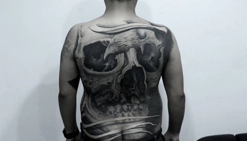 欧美死亡骷髅满背纹身图片_成品背部欧美写实人物鬼神原创纹身图案