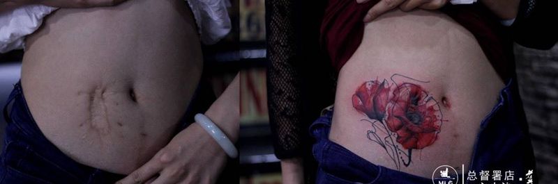 遮盖作品纹身图片_成品手臂腹部清新传统遮盖纹身图案
