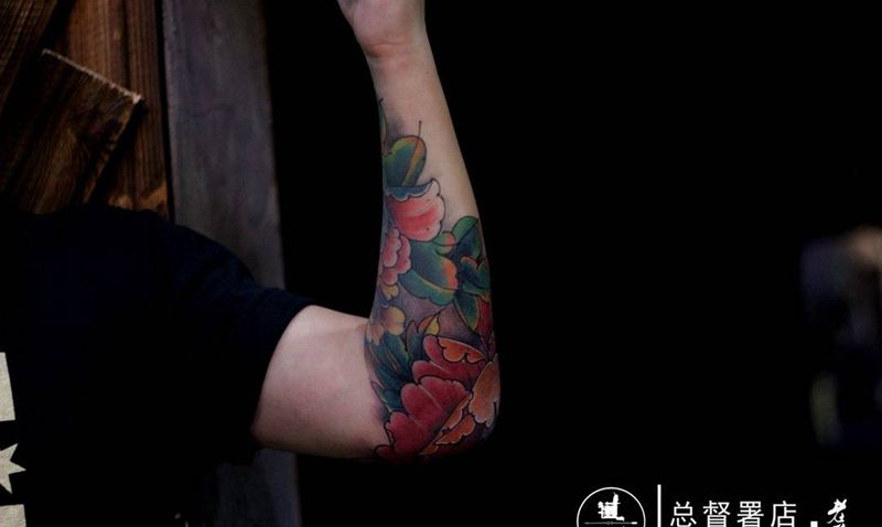 牡丹花臂纹身图片_成品手臂传统国画植物原创纹身图案
