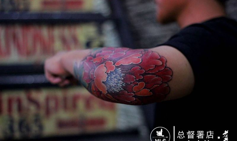 牡丹花臂纹身图片_成品手臂传统国画植物原创纹身图案