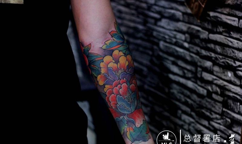 牡丹花臂纹身图片_成品手臂传统国画植物原创纹身图案