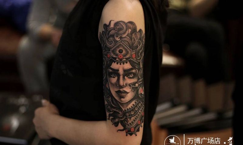 当前位置: 首页 >河北省保定市纹身店-魔罗阁刺青潮店纹身图案>美杜莎纹身图片_成品手臂欧美人物纹身图案