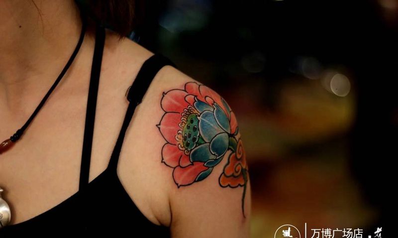当前位置: 首页 >河北省保定市纹身店-魔罗阁刺青潮店纹身图案>莲花纹身图片_成品肩部手臂传统植物原创纹身图案