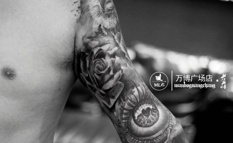 欧美死亡花臂纹身图片_成品手臂欧美写实人物植物宗教原创3D纹身图案