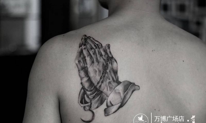 当前位置: 首页 >河北省保定市纹身店-魔罗阁刺青潮店纹身图案>祈祷之手纹身图片_成品肩部欧美写实人物纹身图案