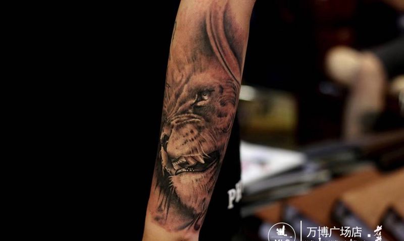 当前位置: 首页 >河北省保定市纹身店-魔罗阁刺青潮店纹身图案>狮子王纹身图片_成品手臂欧美写实肖像动物原创3D纹身图案